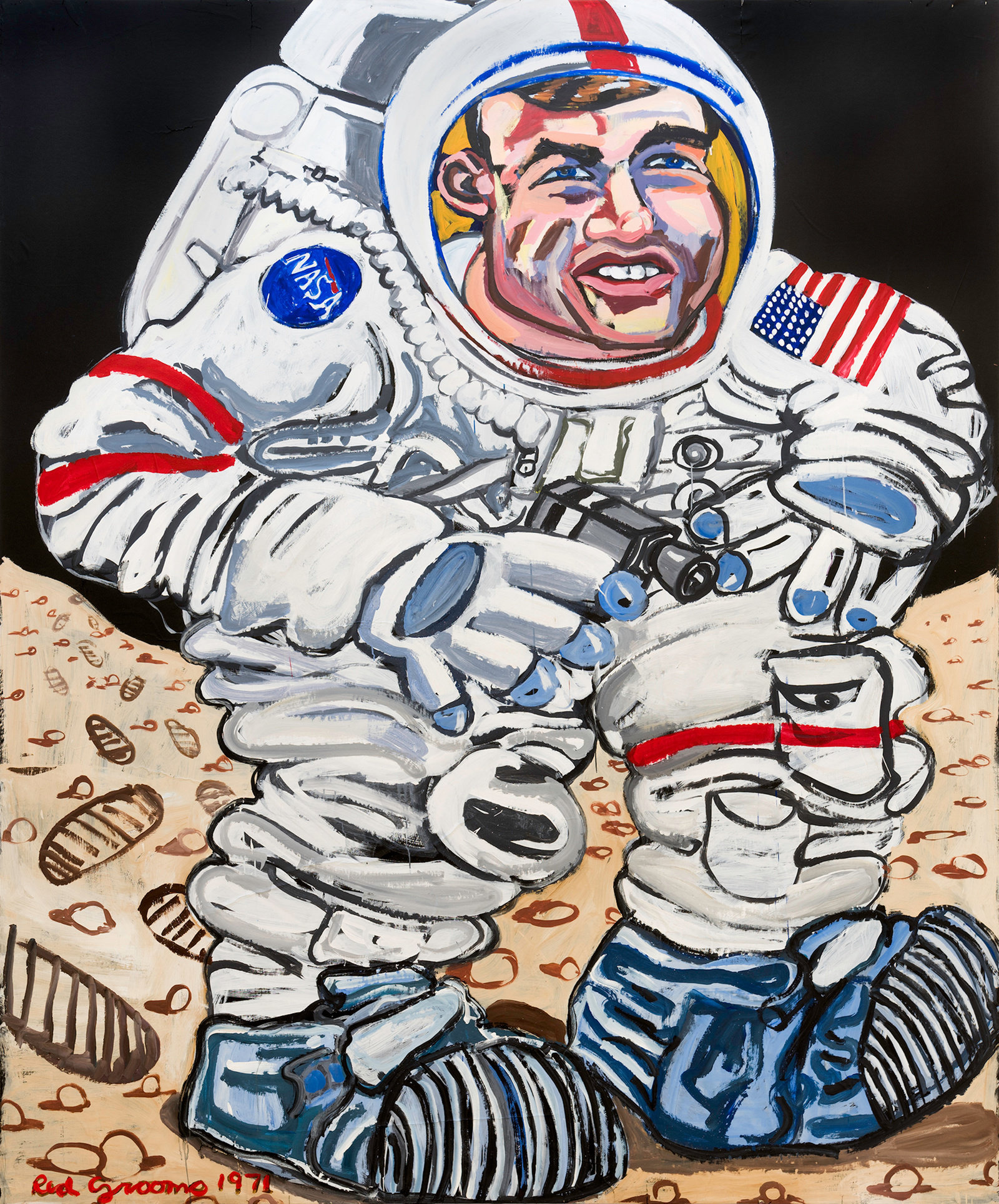 The largest paintings in this exhibition have never been exhibited: The Boating Party is a mural-scale improvisatory painting, circa mid-1970s, of the 18th century French court made as a “warm up” for another project, perhaps in just a couple of sessions. And from 1972 is billboard-sized study for the sculpture Astronauts on the Moon, from the exhibition 10 Independents at the Solomon R. Guggenheim Museum, New York.