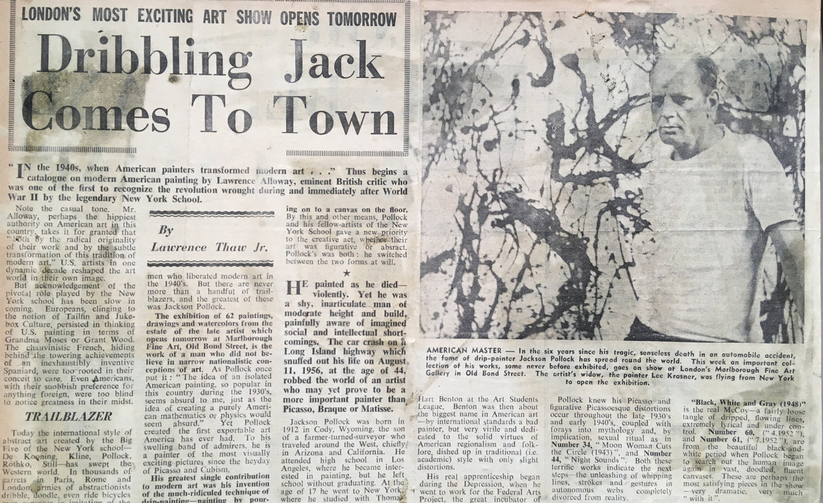 Marlborough's Jackson Pollock exhibition featured in Lawrence Thaw Jr.'s ‘Dribbling Jack Comes To Town,’ published in London/American, May 25, 1961.