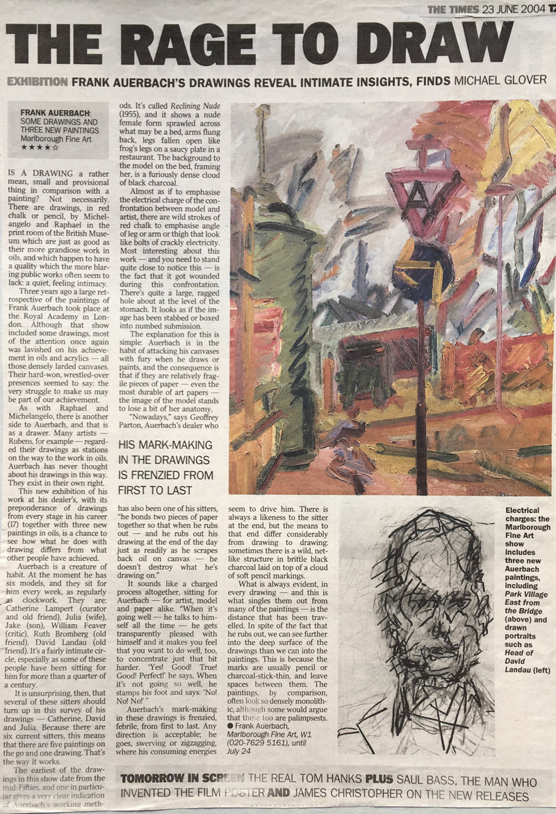Frank Auerbach's summer 2004 exhibition Some Drawings and Three New Paintings featured in Michael Glover's 'The Rage to Draw,' published in The Times, June 23, 2004.