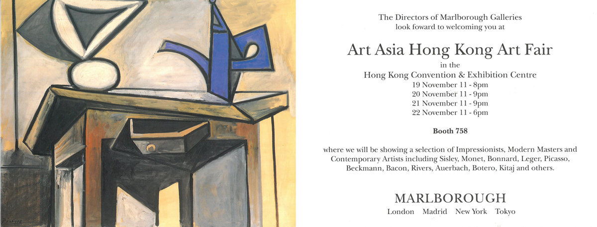 Announcement of Marlborough’s participation in Art Asia Hong Kong Art Fair, November 1983. Image: Pablo Picasso, Still life with Pitcher, 1947, oil on canvas.
